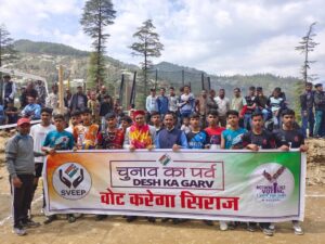 “सुव्यवस्थित मतदाता शिक्षा एवं निर्वाचन सहभागिता” की टीम के द्वारा बाड़ा के देव कामेश्वर मेले में मतदाता जागरूकता अभियान चलाया गया। ग्राम पंचायत एवं मेला कमेटी झुंडी तथा स्वीप टीम ने संयुक्त रूप से एसडीएम थुनाग ललित कुमार पोसवाल को बतौर मुख्य अतिथि आमंत्रित किया। मुख्यातिथि ने मेले में आयोजित की जा रही वॉलीबॉल प्रतियोगिता के फाइनल मैच का शुभारंभ करते हुए खिलाड़ियों तथा दर्शकों को आगामी लोकसभा चुनाव में बढ़ चढ़कर भाग लेने के लिए आवाहन किया। स्वीप टीम द्वारा ग्राम पंचायत झुंडी के सहयोग से मेले में मतदाता जागरूकता हेतु स्टॉल लगाया गया जिसमें आम जनता को प्रेरित करते हुए हस्ताक्षर अभियान चलाया गया । स्वीप टीम ने लोगों को लोकसभा चुनाव 2024 में बढ़ चढ़कर भाग लेने के लिए प्रेरित किया तथा चुनाव से जुड़ी हुई भ्रांतियों का निपटान किया। तथा कहा कि पिछली बार सिराज विधानसभा क्षेत्र के 82% मतदाताओं ने मतदान किया था जिसे इस बार बढ़ाकर 85% करने का लक्ष्य निर्धारित किया गया है। अतः सिराज के सभी मतदाताओं से आवाहन है कि वे बढ़ चढ़कर मतदान में भाग लें तथा दूसरों को भी मतदान में भाग लेने के लिए प्रेरित करें।जिसमें स्थानीय पंचायत के प्रधान नोक सिंह ठाकुर एवं समस्त पंचायत प्रतिनिधियों व मेला कमेटी द्वारा भरपूर सहयोग किया गया। इस कार्यक्रम में एसडीएम थुनाग के साथ निकटवर्ती पंचायतों के प्रतिनिधियों ने भी भाग लिया।