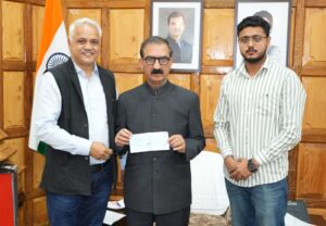 Chief Minister Thakur Sukhvinder Singh Sukhu being presented a cheque of Rs. 77000 by General Secretary Tondon Club Kangra, Nageshwar Mankotia towards Chief Minister Relief Fund at Shimla