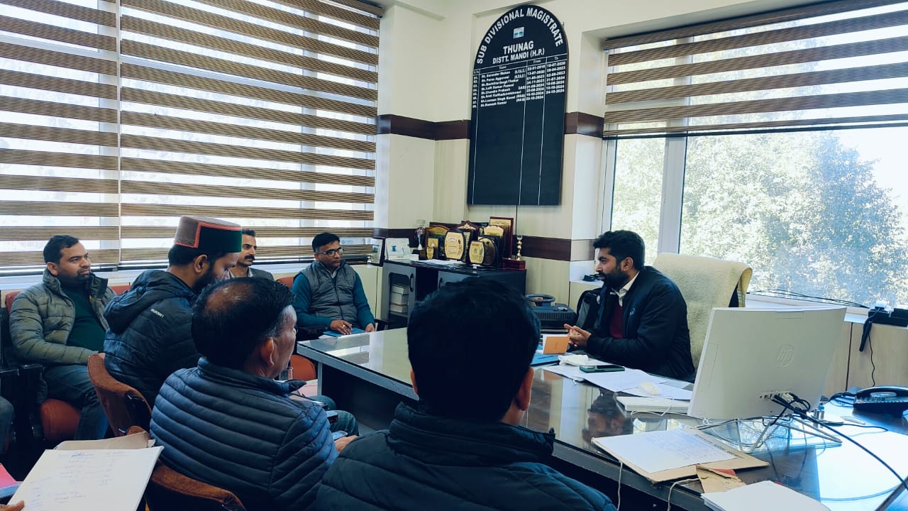 उपमंडल थुनाग के मिनी सचिवालय में 17 नवंबर को आपदा राहत कार्यों व विकास कार्यों की समीक्षा बैठक अतिरिक्त उपायुक्त मंडी गुरसिमर सिंह की अध्यक्षता में आयोजित की गई जिसमें उपमंडल थुनाग के अंतर्गत विभिन विभागाध्यक्षों ने अपनी उपस्थिति दर्ज कारवाई ।इस बैठक में अतिरिक्त उपायुक्त ने उपस्थित सभी विभागों से विकासात्मक कार्यों व आपदा राहत सम्बधी कार्यों का जायजा लिया तथा सभी विभागों को लंबित कार्यों को तीव्रता से निपटाने बारे निर्देश दिए । बैठक में रमेश कुमा उपमंडलाधिकारी (ना0) थुनाग, रमेश कुमार, तहसीलदार थुनाग जितेंद्रर सिंह , सुमित चौहान अधिशाषी अभियंता हि0 प्र0 रा0 वि0 बोर्ड गोहर, संदीप कुमार अधिशाषी अभियंता जल शक्ति मण्डल थुनाग, बँटी कुमार सहायक अभियंता लो0 नि0 वि0 जंजैहली, खंड विकास अधिकारी सराज व अन्य विभागों के अधिकारी उपस्थित रहे ।
